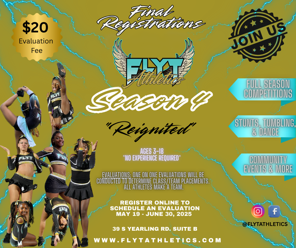 Get ready to tumble, stunt, and shine! Registered athletes are invited to attend free clinics and team evaluations in April and May. These sessions help determine the best team fit for each athlete.