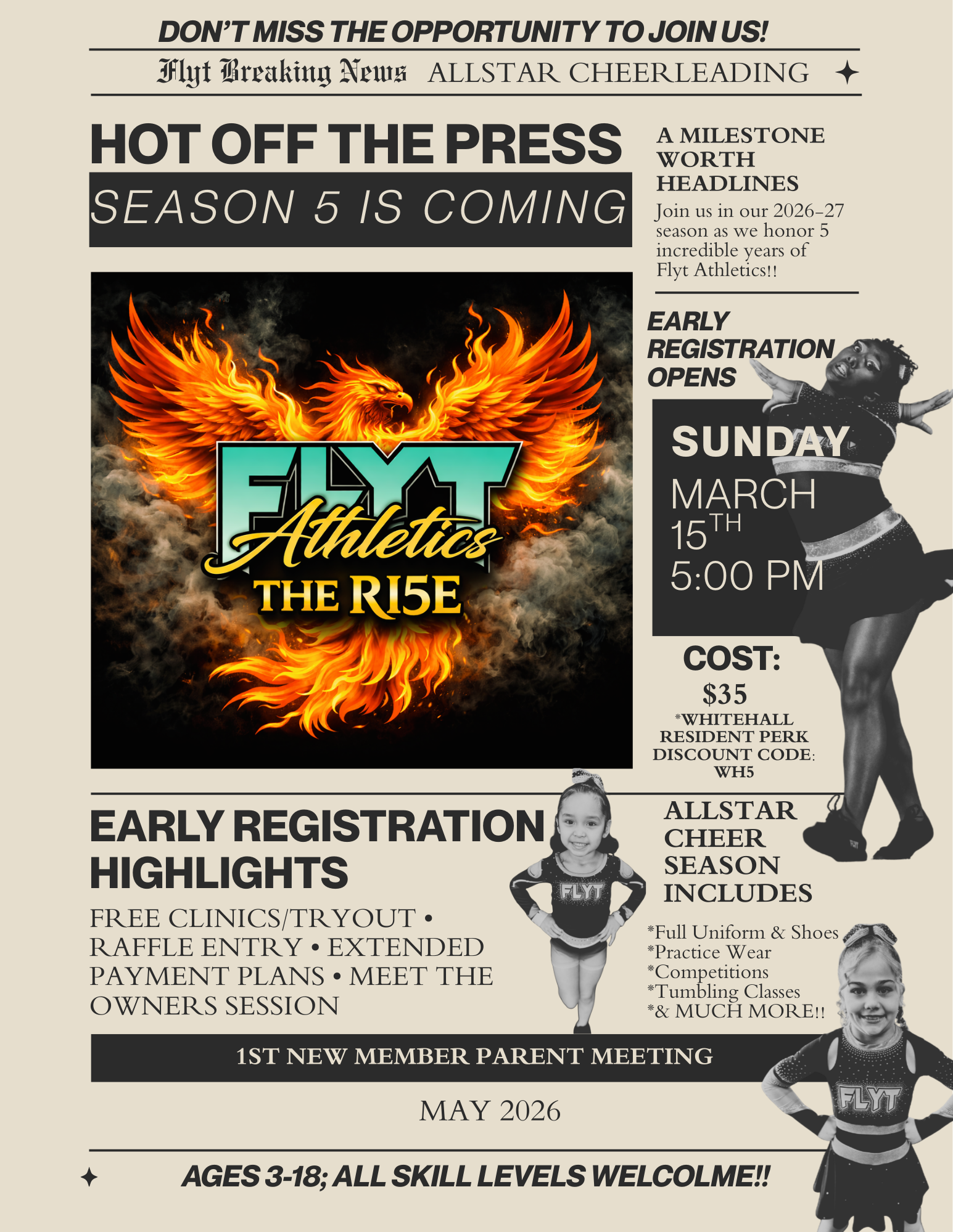 Join us to learn more about Flyt Athletics, review payment options, review policies, discuss tentative event schedules, fundraising, volunteer opportunities, and expectations. Take advantage of fundraising opportunities through April 2026 to support your athletic journey.